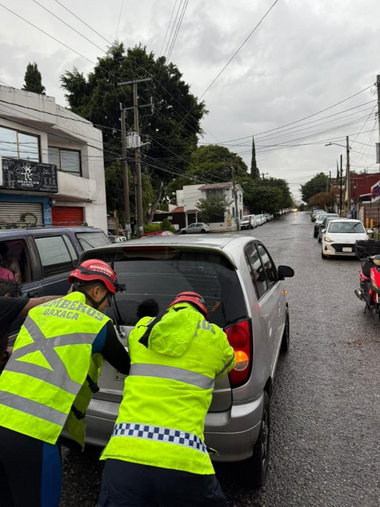 Oaxaca de Juárez, Oax. 5 de octubre de 2025. Elementos del Heroico Cuerpo de Bomberos de Oaxaca (HCBO) atendieron el reporte de encharcamiento severo en la colonia Reforma de la Ciudad de Oaxaca, derivado de la obstrucción de coladeras que impidió el desfogue de agua de lluvia.