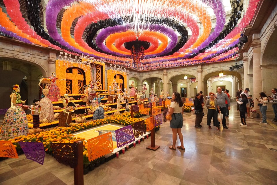 Oaxaca de Juárez, Oax. 6 de noviembre de 2025.- El Palacio de Gobierno fue el escenario en el cual las flores de cempasúchil, calaveras, velas, papel picado, fruta de temporada e imágenes religiosas; enmarcaron el Altar Monumental, apreciado por cerca de 15 mil oaxaqueñas y oaxaqueños, así como turistas nacionales e internacionales.