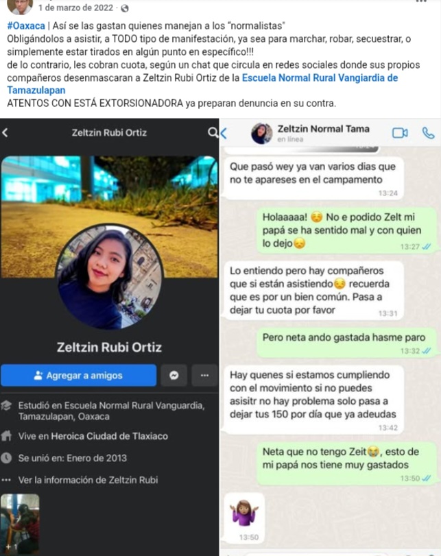 Cabe destacar que Zeltzin Rubí Ortiz Ortiz egresó de la Escuela Normal Rural Vangiardia de Tamazulapan, donde en el año 2022 fue señalada de orquestar movilizaciones violentas en la entidad, obligando a sus compañeros a participar en las mismas, y quienes no cumplían, debían pagar una cuota.