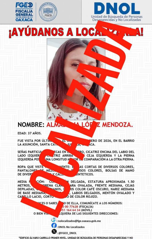 Derivado de las labores de búsqueda e investigación, la mujer fue localizada en inmediaciones de la Ciudad de México. Gracias a la coordinación entre la Fiscalía de Oaxaca y la Fiscalía General de Justicia CDMX, fue ubicada y se confirmó que se encontraba en buen estado de salud.