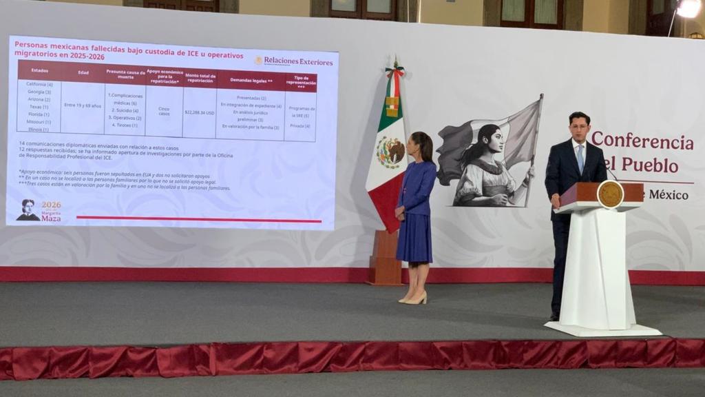 En la conferencia mañanera de hoy, 25 de marzo de 2026, Roberto Velasco Álvarez dijo que 13 personas, de entre 19 y 69 años de edad, han fallecido bajo custodia de ICE, operativos o tiroteos, situación que para el Gobierno de México “es absolutamente inaceptable”.