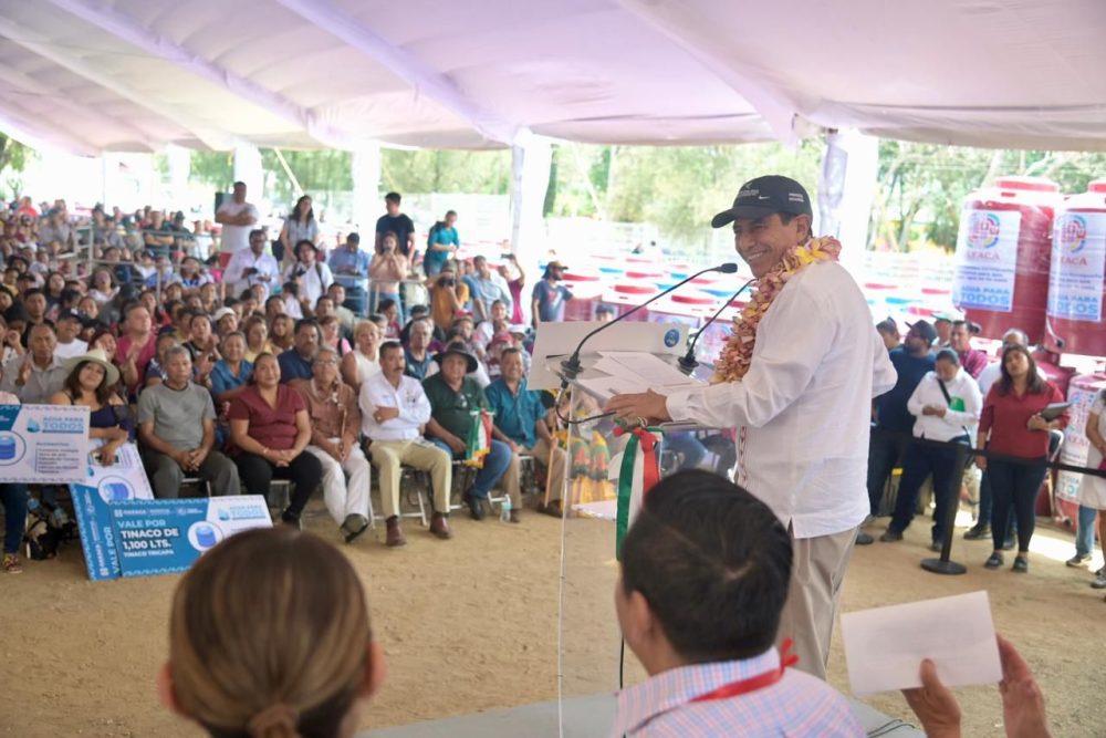 San Sebastián Tutla, Oax. 18 de abril de 2026.- El Gobernador de Oaxaca, Salomón Jara Cruz entregó mil 37 tinacos para el almacenamiento de agua durante esta temporada de estiaje, al mismo número de familias de San Antonio de la Cal, y del Fraccionamiento El Rosario, San Sebastián Tutla.